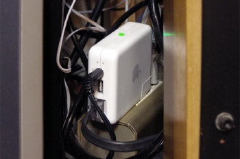 ページ頭の写真で、AirMac Express に繋がっている。上部のアンプとの接合は、最近「プロケーブル」のものに変更した。