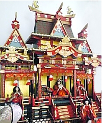 そんなこわい話ばかりの人形だが、とんでもなく陽気な人形の存在を最近知った。下の写真をご覧いただければ分かると思うが雛人形だ。このお雛様、御殿造りという形式の名古屋版のお雛様なのだそうだ。すごいキンキラキンの御殿の屋根には「シャチホコ」が輝いている!