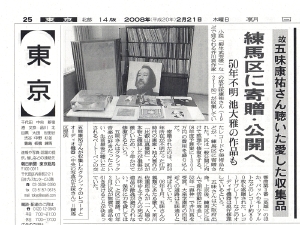 2月21日付の朝日新聞東京版に「故、五味康祐さん聴いた愛した収集品/練馬区へ寄贈・公開へ」というコラム記事が載っていた。芥川賞作家 五味康祐氏は、オーディオ・レコードに造詣が深いことで、マニアには一目置かれた存在であった。その五味康祐氏のレコード・オーディオ機器・美術品を、居住していた練馬区が1300万円の費用を盛り込んで、整理・修復、一般公開をするのだという。記事を裏読みすると、どうやら寄贈された美術品の価値がクローズアップされているようで、レコード・オーディオ機器の方は、美術品を引き取ることの交換条件のような案配だ。ま、そんな穿った見方をするのは不謹慎な、りっぱな公費の使い方だとは思う。