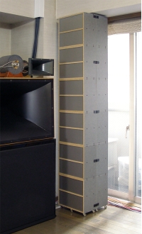 左の写真のように、右チャンネルスピーカーと穿きだしサッシ窓の間のわずかなスペースを活かすべく製作した、縦長可動式のラックである。