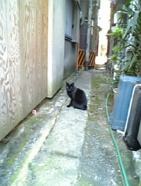 黒猫三兄弟の路地にも朝ご飯中の一匹。