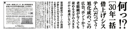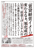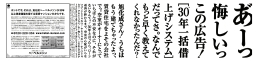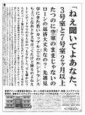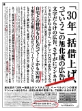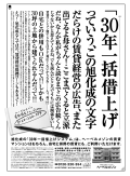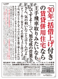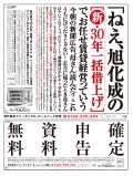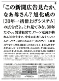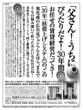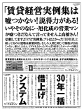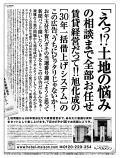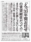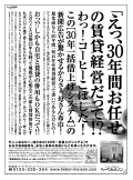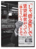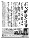 別のページで「タイポグラフィ広告」をいくつかご覧いただきましたが、ここではひと味趣向のちがう「タイポグラフィ広告」をご紹介します。前ページでご紹介した一連の「漫画手法広告」と同じ、賃貸マンション経営を訴求する広告です。タイポグラフィの「美しさ」をねらったものではなく、あえてビジュアルに頼らず、コピーワークだけで訴求しようと覚悟して企画しました。文字サイズが小さく変化していく独自の手法を開発、多いときは1000件以上!少なくとも500件程度の驚異的なレスポンスがある、強い説得力を持つ原稿となりました。