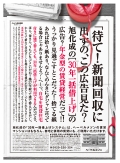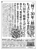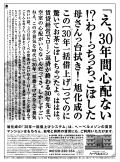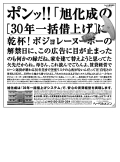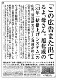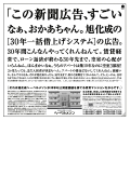 『「漫画手法」のエッセンスだけを抽出したらいいんじゃないか』というのがこの「タイポグラフィ広告」企画の原点でした。2001年1月に一本目を出稿してから、これまでの9年間に44本もの原稿をつくりました。しかもその訴求内容は「ほとんど同じ」です。初期では、語り手を替えたり、大阪弁だったりとモノクロで文字だけのデザインですが、注目率を上げるために次第に色を入れたり、マーキングしたりと話の内容に関連したイメージビジュアルを添えたりしていきます。さらに、新聞広告という出自を遊ぶかのように、お茶をこぼしてみたり落花生の殻受けにしたりと、いろいろなアイディアを取り入れてレスポンス向上につとめました。この手法の広告は現在もつづいています。